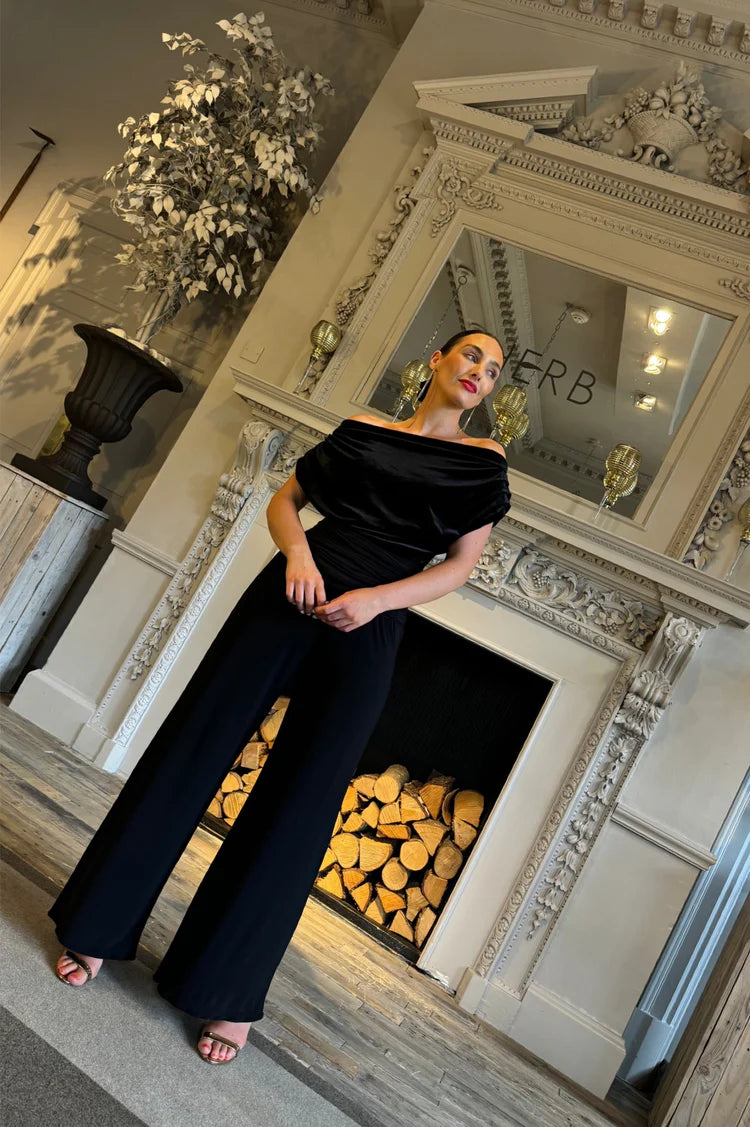Experience luxury and elegance with our AW24 ATOM LABEL carbon jumpsuit. This timeless piece combines classic black with the softness of velvet, creating a rich and sophisticated look. The wide, draped legs provide both comfort and a flattering silhouette, while the pleated tummy coverage adds a touch of grace. Elevate your wardrobe with this beautiful and exclusive jumpsuit.
