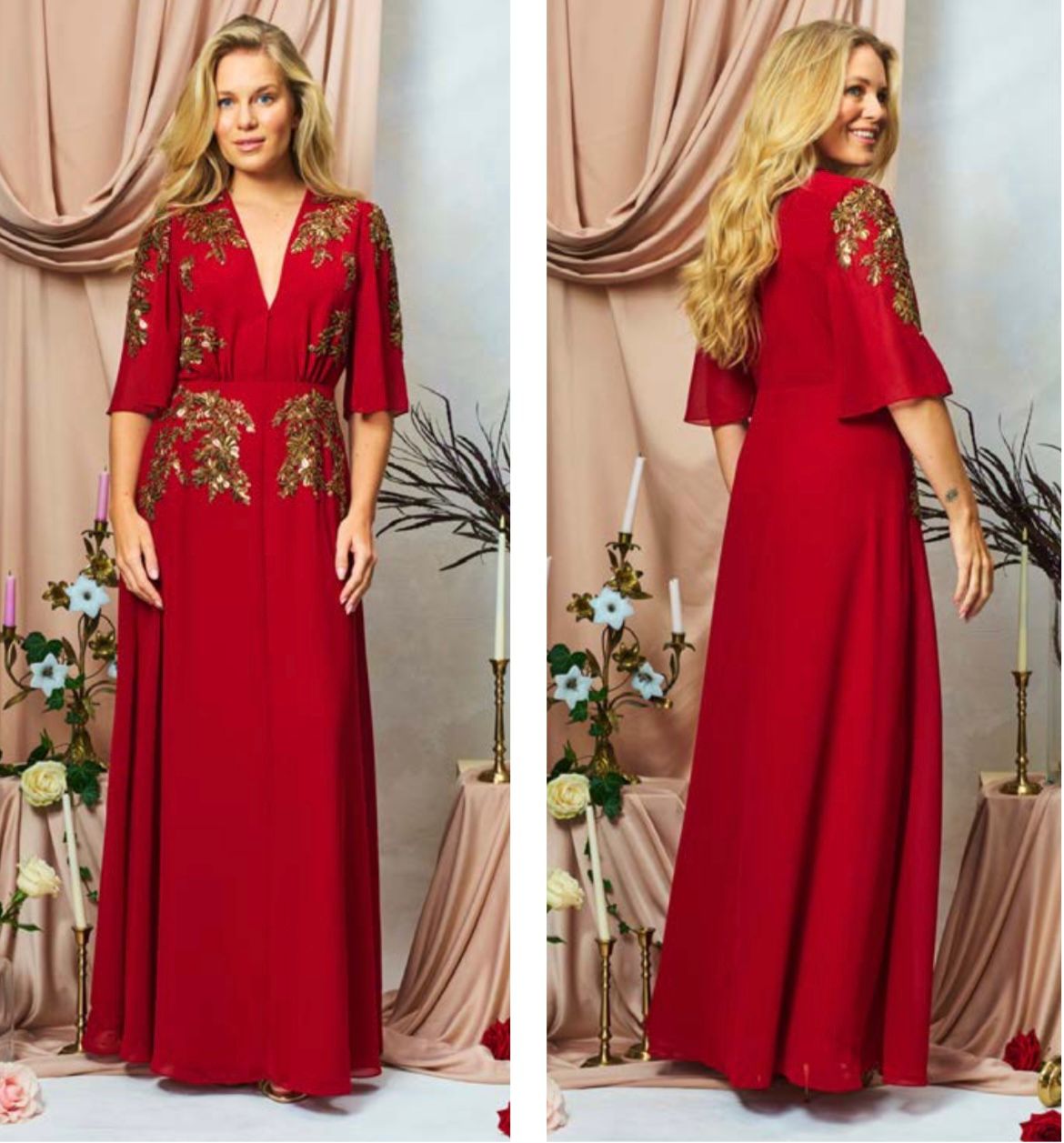The Gretal showcases Hope & Ivy embellishment and design at its very best, with sparkling sequins in shades of rich gold decorating the bust, sleeves, and skirt of this burgundy evening gown. Flutter sleeves and a plunging neckline create a beautiful silhouette, while the cascading skirt finishes at sweeping floor length, and the hidden hook and eye detail on the neckline allows for the plunge to be adjusted as desired. This is the perfect party piece for making an entrance at any event this season.